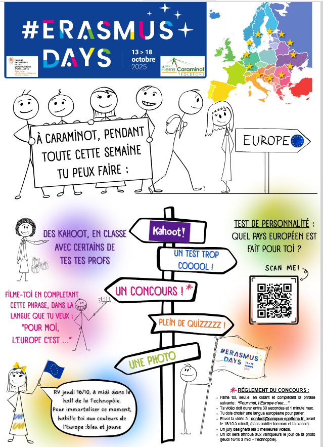 Afin de sensibiliser la communauté du lycée sur l'ouverture Européenne et internationnale, sonder l'opinion des jeunes et des familles sur les projets de mobilités en cours et à venir, nous avons proposé une semaine d'activités, d'information, de sondages, de jeux et de concours !